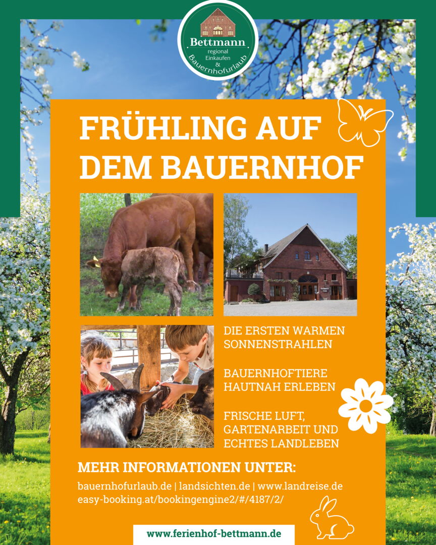 Im März beginnt auf dem Ferienhof Bettmann in Ennigerloh eine ganz besondere Zeit: Der Frühling hält Einzug und mit ihm kehrt neues Leben auf den Hof zurück. Nach den ruhigen Wintermonaten werden die Tage wieder länger, die Sonne zeigt sich häufiger und die Natur beginnt zu blühen.