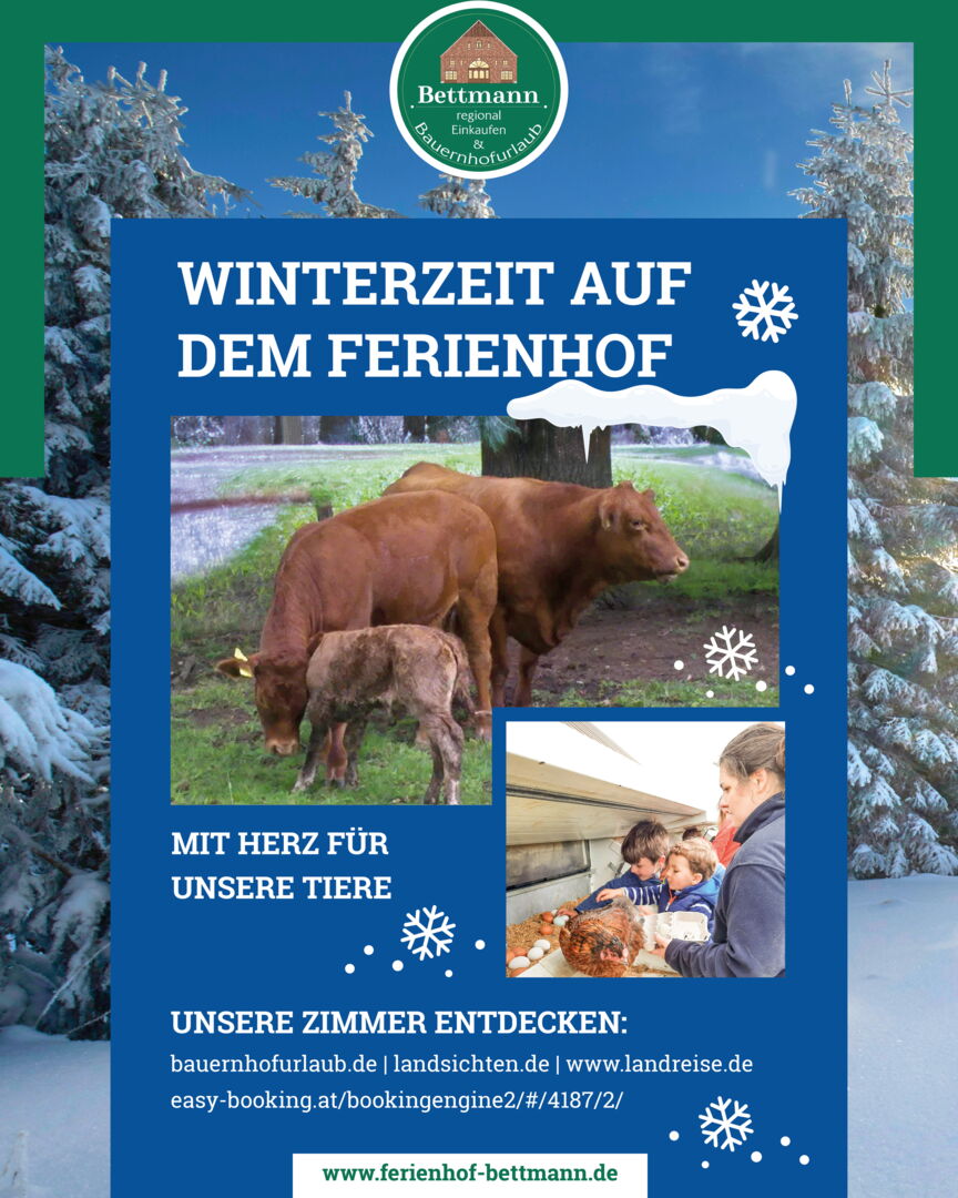 Wenn Sie auf der Suche sind nach einer besonderen Auszeit im November oder der Adventszeit – dann ist der Ferienhof Bettmann Ihre Adresse. Hier erleben Sie, wie Tiere behutsam durch den Winter kommen, wie Familien gemeinsam staunen und entspannen können, und wie ländliches Leben mit Verantwortung und Wärme verbunden ist. Wir freuen uns, Sie bei uns willkommen zu heißen – mit Ihrer Familie, Ihren Fragen und Ihrer Lust auf Natur und Tierwohl.